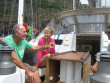 Geschrieben von Michael Schau am22.07.2015: Am 21.07.2015 warfen wir um 12.15 Uhr die Leinen los und segelten mit ablaufender Tide aus der Bucht von Brest. Um 15.00 Uhr drehte die Tide und mit dem auflaufenden Wasser drehten wir in den Englischen Kanal ein. Während der ganzen Reise kam der Wind aus SW mit einer Stärke von nie mehr als 2 Bft. Trotzdem machten wir mit dem Strom über längere Zeit 6 kn Fahrt. In der Nacht, vor der Insel Ile de Batz war dann der Spaß vorbei, der Strom kam jetzt gegenan und unsere Fahrt ging gegen 0. Als dann die Tide wieder drehte, ging es, immer noch mit Wind SW 2 Bft flott weiter und um 10.00 Uhr am 22.07 2015 starteten wir den Motor und waren um 10.20 Uhr in der Marina in Trebeurden fest. Dieses ist ein typischer Hafen der Bretagne. Die Einfahrt und Zufahrt des Hafens fällt bei Ebbe total trocken durch ein Süll, welches man nur bei einem gewissen Wasserstand passieren kann, bleibt im Hafen genügend Wasser, damit die dort liegenden Schiffe immer schwimmen. Unsere Position: 48°46,2'N 3°35,1'W Gestern Abend lief eine ganze Flotte holländischer Boote ein. Ich hatte eine nette Unterhaltung mit einem der Skipper. Er erzählte mir, sie wollten alle zur Belle Ile in der Biskaya und dann an der englischen Südküste zurück nach Holland - eine schöne Sommerreise. Sie haben aber von Holland schon 5 Wochen hierher gebraucht, da das Wetter durchgehend schlecht war. 24.07.2015 Eingeweht - Seit gestern ziehen 2 Tiefdruckgebiete über uns hinweg. Regen, starker Wind, der Sturm kommt noch - wir müssen warten, was nicht schwer ist, da wir hier im Hafen sicher liegen. Seit gestern bullert unser Reflex-Ofen und im Boot ist es mollig warm. Hier ein Auszug aus dem heutigen Wetterbericht: Low just W of Fitzroy (das ist das Wettergebiet westl. des Englischen Kanals) 1008 expected southern Plymouth 1002 by Midday tomorrow. Portland, Plymouth (das ist unser Wettergebiet) variable 4 becomming cyclonic mainly NE 5 to 7, Gale 8 in Plymouth. Da gehen wir doch besser zum Bäcker und holen uns ein leckeres Stück Kuchen. 31.07.2015 Nachdem wir fast eine Woche in Trebeurden gelegen hatten und ein Sturmtief nach dem anderen über uns hinweg gezogen war, legten wir endlich am 28.07.2015 um 07.00 Uhr ab. Bei noch sehr starkem Wind ging es flott Richtung Guernsey, wo wir abends genau bei Stauwasser ankamen und um 21.20 Uhr vor St. Peter Port ankerten und anschließend sofort in die Kojen fielen. Am nächsten Morgen, den 29.07. ging es mit der Tide um 07.00 Uhr Anker auf Richtung Alderney/Cherbourg. Um 12.00 Uhr war der Spaß vorbei, das Boot machte trotz des starken achterlichen Windes keine Fahrt mehr voraus; im Gegenteil, wir machten in der hohen, achterlichen, steilen, sich laufend brechenden See Fahrt über den Achtersteven, denn wir hatten jetzt den vollen Tidenstrom gegenan. Drei lange Stunden mussten wir ausharren. Endlich um 15.00 Uhr ging es langsam voran und es dauerte nicht lange und mit 8 kn Fahrt näherten wir uns rasch Cherbourg, wo wir um 20.45 Uhr an einem Ponton sehr erschöpft festmachten. Am nächsten Morgen, den 30.07.2015, warfen wir um 06.05 Uhr die Leinen los und seglten, die ersten 40 Min. noch unter Motor Richtung St. Vaast in der Normandie, wo unsere französischen Freunde von der Alioth ( mit Ihnen waren wir in Patagonien mehrmals zusammen) schon seit Tage auf uns warteten. Aber diese kleine Reise hatte es in sich! Da wir es durch segeln nicht schafften vor Schließung der Schleuse rechtzeitig anzukommen, starteten wir den Motor. Schnell stellte sich heraus, dass der defekte Niro-Auspuff ein sehr großes Loch hatte und sehr viel Wasser in die Bilge strömte. Ich konnte auch nichts reparieren, da wir uns zu dicht unter Land befanden. Aber wir haben eine Whale Gusher Handpumpe mit der ich locker die Bilge trocken halten konnte. Nach eine halben Stunde riss jedoch der Gummibalg und die Pumpe war nutzlos. Unsere elekrische Bilgepumpe lief auch, aber es stellte sich heraus, dass die Durchflußlöcher in den Spanten viel zu klein sind. Also startete ich unsere elektrische Impeller-Lenzpumpe, welche ich vor einem Jahr überholt hatte. Sie startet sofort, förderte aber kein Wasser. Jetzt erinnerte ich mich an den alten Spruch "die beste Lenzpumpe ist ein Mann mit einem Eimer" und tatsächlich gelang es, mir den Wasserstand im Maschinenraum konstant zu halten, zwischendurch nahm ich noch die Segel weg und machte die Leinen und Fender klar - das war echter Sport!!!! um 11.45 Uhr am 30.07. waren wir endlich in St. Vaast fest, wo unser Freund Dominique uns schon erwartete. Seit einiger Zeit haben wir ein ganz wenig Wasser in der Bilge im Maschinenraum, ich konnte aber das Leck nicht finden. Da die Bilge auf Grund des gestrigen Abenteuers ölig ist, sah ich heute Morgen ein feines Rinnsal aus einer Schweißnaht entweichen. Das Boot kam sofort an Land und jetzt werden folgende Reparaturen ausgeführt. Auspuff Instand setzten, Tank reinigen, neue Separ-Doppelfilteranlage einbauen, Schweißnaht-Lecksuche und schweißen. Wir liegen hier in dem schönen Städtchen St. Vaast und fühlen uns hier sehr wohl, in der Austernbar der Fischereigenossenschaft nur ein paar Meter vom Boot entfernt, ließ ich mich gestern gleich nieder. Die große Fischereiflotte bringt laufend frischen Fisch und wir haben viel Spaß mit der Crew von der Alioth, wir sollen auch unbedingt im Haus von Dominique schlafen, was wir auch machen werden. Unsere Position: 49°35,3'N 1°15,9'W. 06.08.2015 Seitdem wir an Land stehen, wohnen wir bei unseren Freunden Dominique und Arielle. Das schloßähnliche Anwesen nimmt uns ganz gefangen. Die Haupthalle hat ungefähr den Grundriss unseres Hauses und wieviel Zimmer es gibt, wissen wir nicht. In dem wunderschönen Park gibt es neben Obstbäumen herrliche, hohe Palmen sowie einen großen Wallnußbaum. Vor einigen Tagen waren wir bei Christiane und Luc in Barfleur eingeladen ( alle vier zusammen bilden die Crew der SY ALIOTH). Schon wieder standen wir vor eine