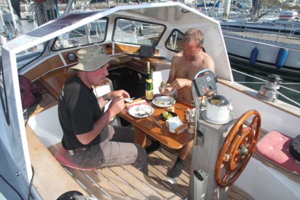 22.07.2015: Am 21.07.2015 warfen wir um 12.15 Uhr die Leinen los und segelten mit ablaufender Tide aus der Bucht von Brest. Um 15.00 Uhr drehte die Tide und mit dem auflaufenden Wasser drehten wir in den Englischen Kanal ein. Während der ganzen Reise kam der Wind aus SW mit einer Stärke von nie mehr als 2 Bft. Trotzdem machten wir mit dem Strom über längere Zeit 6 kn Fahrt. In der Nacht, vor der Insel Ile de Batz war dann der Spaß vorbei, der Strom kam jetzt gegenan und unsere Fahrt ging gegen 0. Als dann die Tide wieder drehte, ging es, immer noch mit Wind SW 2 Bft flott weiter und um 10.00 Uhr am 22.07 2015 starteten wir den Motor und waren um 10.20 Uhr in der Marina in Trebeurden fest. Dieses ist ein typischer Hafen der Bretagne. Die Einfahrt und Zufahrt des Hafens fällt bei Ebbe total trocken durch ein Süll, welches man nur bei einem gewissen Wasserstand passieren kann, bleibt im Hafen genügend Wasser, damit die dort liegenden Schiffe immer schwimmen. Unsere Position: 48°46,2'N 3°35,1'W Gestern Abend lief eine ganze Flotte holländischer Boote ein. Ich hatte eine nette Unterhaltung mit einem der Skipper. Er erzählte mir, sie wollten alle zur Belle Ile in der Biskaya und dann an der englischen Südküste zurück nach Holland - eine schöne Sommerreise. Sie haben aber von Holland schon 5 Wochen hierher gebraucht, da das Wetter durchgehend schlecht war. 24.07.2015 Eingeweht - Seit gestern ziehen 2 Tiefdruckgebiete über uns hinweg. Regen, starker Wind, der Sturm kommt noch - wir müssen warten, was nicht schwer ist, da wir hier im Hafen sicher liegen. Seit gestern bullert unser Reflex-Ofen und im Boot ist es mollig warm. Hier ein Auszug aus dem heutigen Wetterbericht: Low just W of Fitzroy (das ist das Wettergebiet westl. des Englischen Kanals) 1008 expected southern Plymouth 1002 by Midday tomorrow. Portland, Plymouth (das ist unser Wettergebiet) variable 4 becomming cyclonic mainly NE 5 to 7, Gale 8 in Plymouth. Da gehen wir doch besser zum Bäcker und holen uns ein leckeres Stück Kuchen. 31.07.2015 Nachdem wir fast eine Woche in Trebeurden gelegen hatten und ein Sturmtief nach dem anderen über uns hinweg gezogen war, legten wir endlich am 28.07.2015 um 07.00 Uhr ab. Bei noch sehr starkem Wind ging es flott Richtung Guernsey, wo wir abends genau bei Stauwasser ankamen und um 21.20 Uhr vor St. Peter Port ankerten und anschließend sofort in die Kojen fielen. Am nächsten Morgen, den 29.07. ging es mit der Tide um 07.00 Uhr Anker auf Richtung Alderney/Cherbourg. Um 12.00 Uhr war der Spaß vorbei, das Boot machte trotz des starken achterlichen Windes keine Fahrt mehr voraus; im Gegenteil, wir machten in der hohen, achterlichen, steilen, sich laufend brechenden See Fahrt über den Achtersteven, denn wir hatten jetzt den vollen Tidenstrom gegenan. Drei lange Stunden mussten wir ausharren. Endlich um 15.00 Uhr ging es langsam voran und es dauerte nicht lange und mit 8 kn Fahrt näherten wir uns rasch Cherbourg, wo wir um 20.45 Uhr an einem Ponton sehr erschöpft festmachten. Am nächsten Morgen, den 30.07.2015, warfen wir um 06.05 Uhr die Leinen los und seglten, die ersten 40 Min. noch unter Motor Richtung St. Vaast in der Normandie, wo unsere französischen Freunde von der Alioth ( mit Ihnen waren wir in Patagonien mehrmals zusammen) schon seit Tage auf uns warteten. Aber diese kleine Reise hatte es in sich! Da wir es durch segeln nicht schafften vor Schließung der Schleuse rechtzeitig anzukommen, starteten wir den Motor. Schnell stellte sich heraus, dass der defekte Niro-Auspuff ein sehr großes Loch hatte und sehr viel Wasser in die Bilge strömte. Ich konnte auch nichts reparieren, da wir uns zu dicht unter Land befanden. Aber wir haben eine Whale Gusher Handpumpe mit der ich locker die Bilge trocken halten konnte. Nach eine halben Stunde riss jedoch der Gummibalg und die Pumpe war nutzlos. Unsere elekrische Bilgepumpe lief auch, aber es stellte sich heraus, dass die Durchflußlöcher in den Spanten viel zu klein sind. Also startete ich unsere elektrische Impeller-Lenzpumpe, welche ich vor einem Jahr überholt hatte. Sie startet sofort, förderte aber kein Wasser. Jetzt erinnerte ich mich an den alten Spruch "die beste Lenzpumpe ist ein Mann mit einem Eimer" und tatsächlich gelang es, mir den Wasserstand im Maschinenraum konstant zu halten, zwischendurch nahm ich noch die Segel weg und machte die Leinen und Fender klar - das war echter Sport!!!! um 11.45 Uhr am 30.07. waren wir endlich in St. Vaast fest, wo unser Freund Dominique uns schon erwartete. Seit einiger Zeit haben wir ein ganz wenig Wasser in der Bilge im Maschinenraum, ich konnte aber das Leck nicht finden. Da die Bilge auf Grund des gestrigen Abenteuers ölig ist, sah ich heute Morgen ein feines Rinnsal aus einer Schweißnaht entweichen. Das Boot kam sofort an Land und jetzt werden folgende Reparaturen ausgeführt. Auspuff Instand setzten, Tank reinigen, neue Separ-Doppelfilteranlage einbauen, Schweißnaht-Lecksuche und schweißen. Wir liegen hier in dem schönen Städtchen St. Vaast und fühlen uns hier sehr wohl, in der Austernbar der Fischereigenossenschaft nur ein paar Meter vom Boot entfernt, ließ ich mich gestern gleich nieder. Die große Fischereiflotte bringt laufend frischen Fisch und wir haben viel Spaß mit der Crew von der Alioth, wir sollen auch unbedingt im Haus von Dominique schlafen, was wir auch machen werden. Unsere Position: 49°35,3'N 1°15,9'W. 06.08.2015 Seitdem wir an Land stehen, wohnen wir bei unseren Freunden Dominique und Arielle. Das schloßähnliche Anwesen nimmt uns ganz gefangen. Die Haupthalle hat ungefähr den Grundriss unseres Hauses und wieviel Zimmer es gibt, wissen wir nicht. In dem wunderschönen Park gibt es neben Obstbäumen herrliche, hohe Palmen sowie einen großen Wallnußbaum. Vor einigen Tagen waren wir bei Christiane und Luc in Barfleur eingeladen ( alle vier zusammen bilden die Crew der SY
